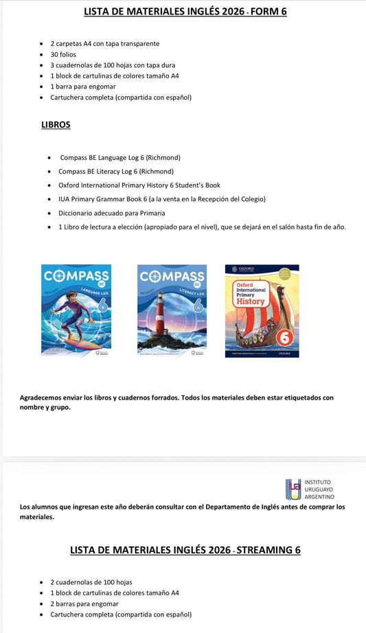 Lista Completa Colegio IUA 6º Español e Inglés 2026