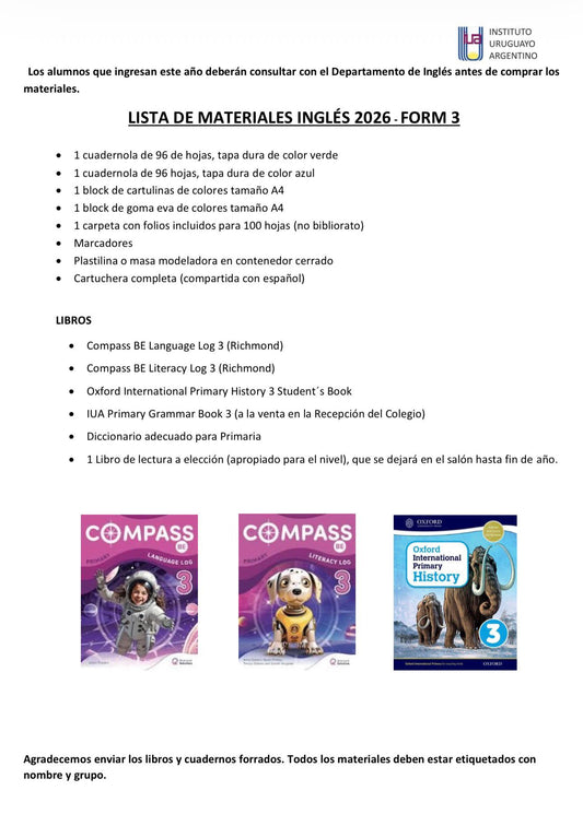 Lista Completa Colegio IUA 3º Español e Inglés 2026