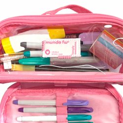 1 compartimento superior de pvc transparente con apertura en el frente y en el dorso . Un segundo compartimento en la base (apertura 180°) con 2 lados de 6 elásticos cada uno. 1 manija superior. Tamaño : 22 X 9,5 X13 cm. Tres colores surtidos.