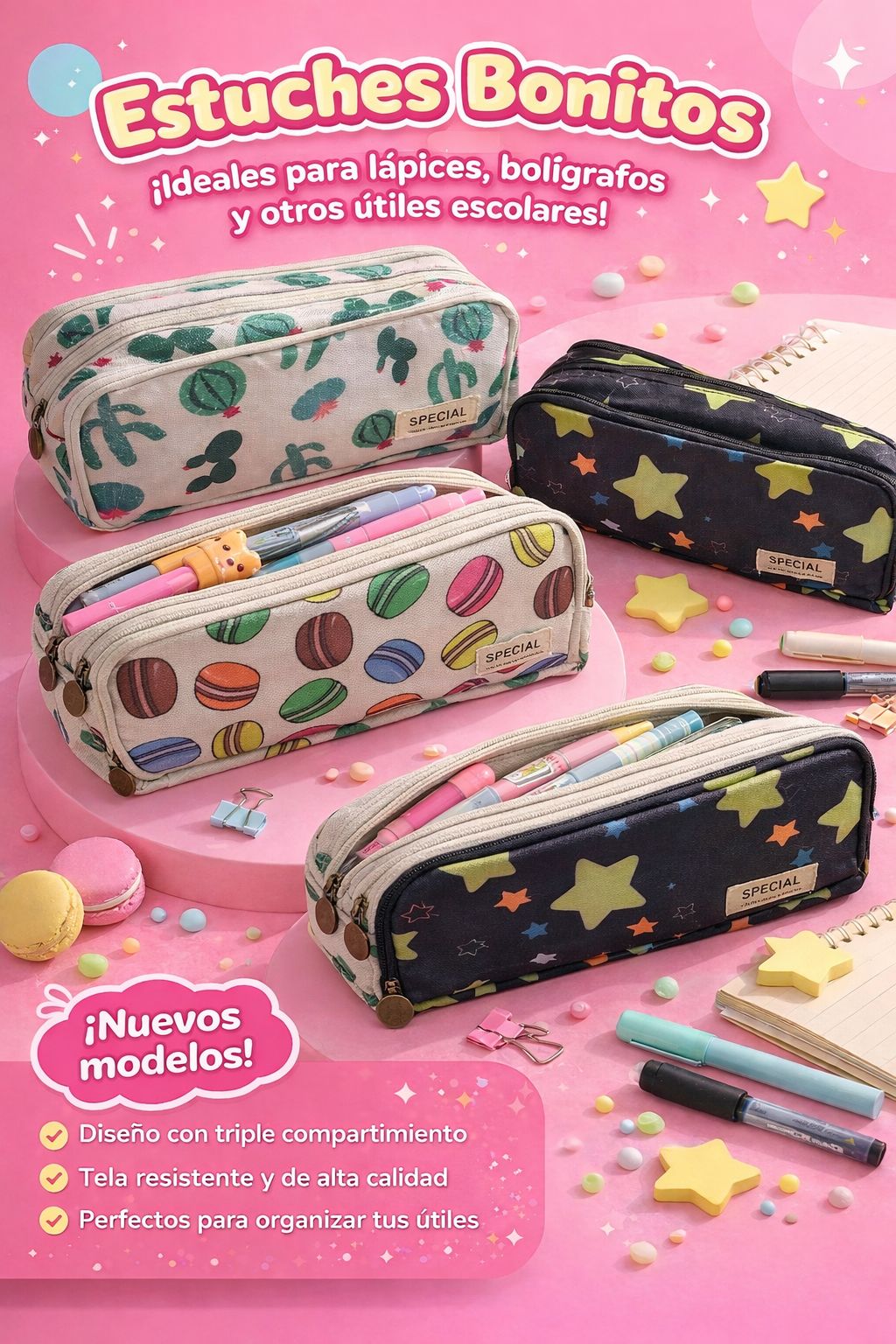 Cartuchera Saroo Special con 3 Reparticiones, tres modelos diferentes. Medidas 22cm de largo x 11cm de alto