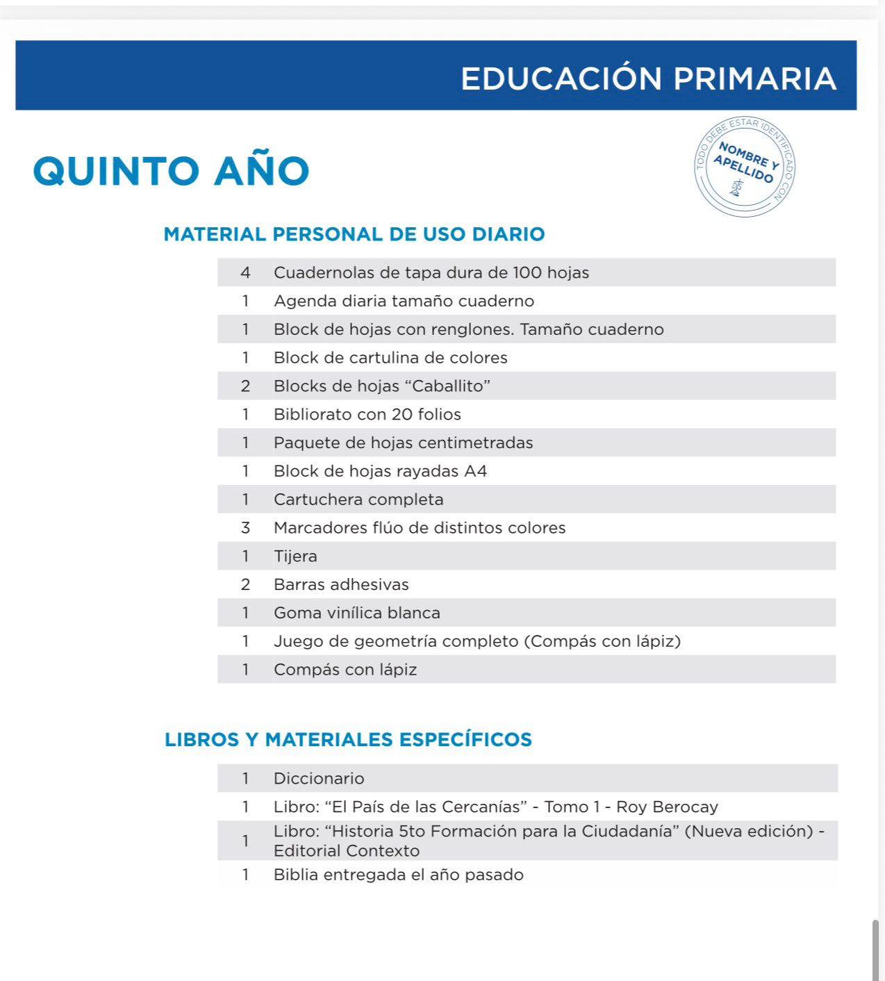 En esta lista, está la totalidad de los artículos solicitados por el Colegio, con excepción de los libros de lectura y de cuentos.