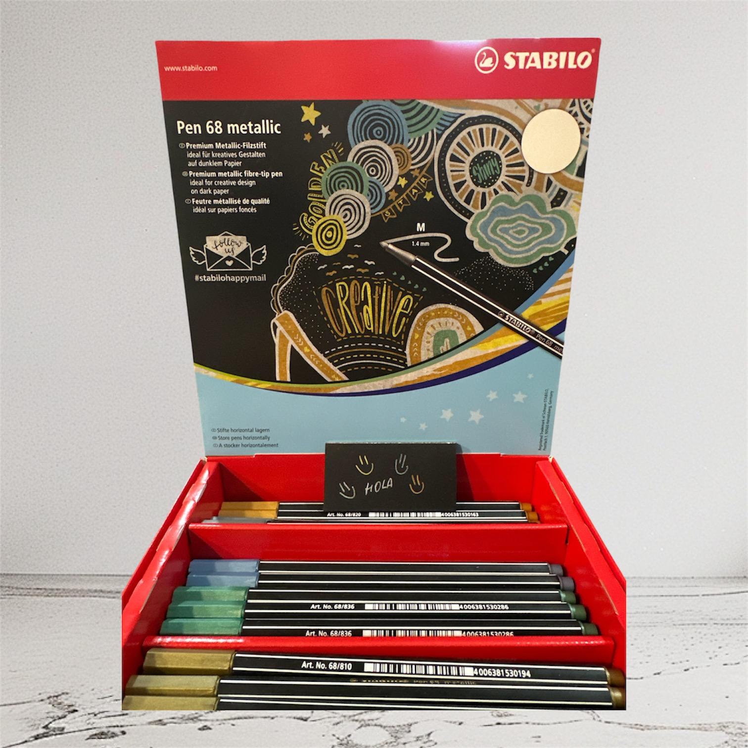 Dale un brillo especial a tus creaciones con los nuevos marcadores metálicos de Stabilo, calidad premium. Ya sean en tarjetas de cumpleaños, invitaciones o lettering, su color opaco y punta robusta de 1.4 mm hacen que sean ideales para trabajar en papeles oscuros y cartulinas. Al igual que en el popular rotulador Pen 68, su tinta es a base de agua. No necesita agitarse para que el color se aplique correctamente. Disponible en color azul, dorado, cobre, plateado y verde metalizado.