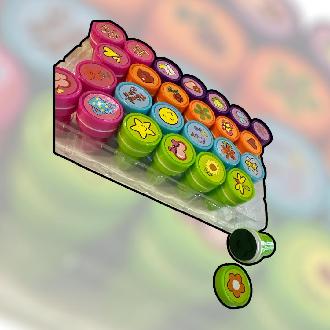 Sellos con diseños infantiles, incluye tinta, variedad de diseños para hacer las decoraciones o correcciones mas divertidas!!!!