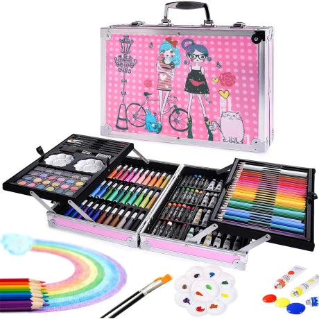 SET VALIJA METÁLICA ARTE ESCOLAR DIDÁCTICO 145 PIEZAS • Conjunto de arte, motiva las grandes habilidades artísticas de de los niños con este increíble conjunto de arte de 145 piezas. • El set viene en una valija metálica de transporte fácil de plegar, lo que lo hace portátil para llevarlo a cualquier parte. Incluye: - 24 pasteles al óleo - 33 marcadores - 28 lápices de colores - 24 acuarelas - 2 gomas de borrar - 4 pinceles diferentes - 1 saca puntas - 2 lápices - 2 platitos para mezclar colores - 24 pinturas al agua • Edad: +3 años • Dimensiones: 34x23x8,5cm